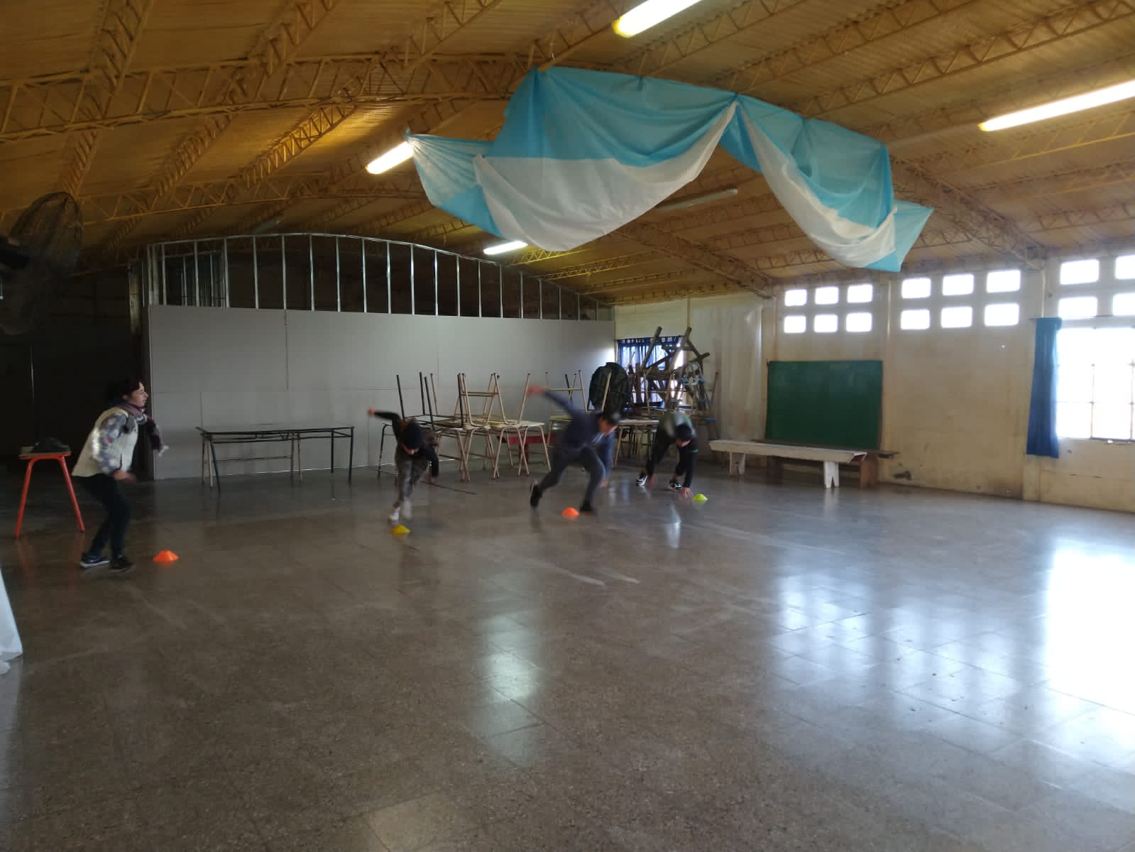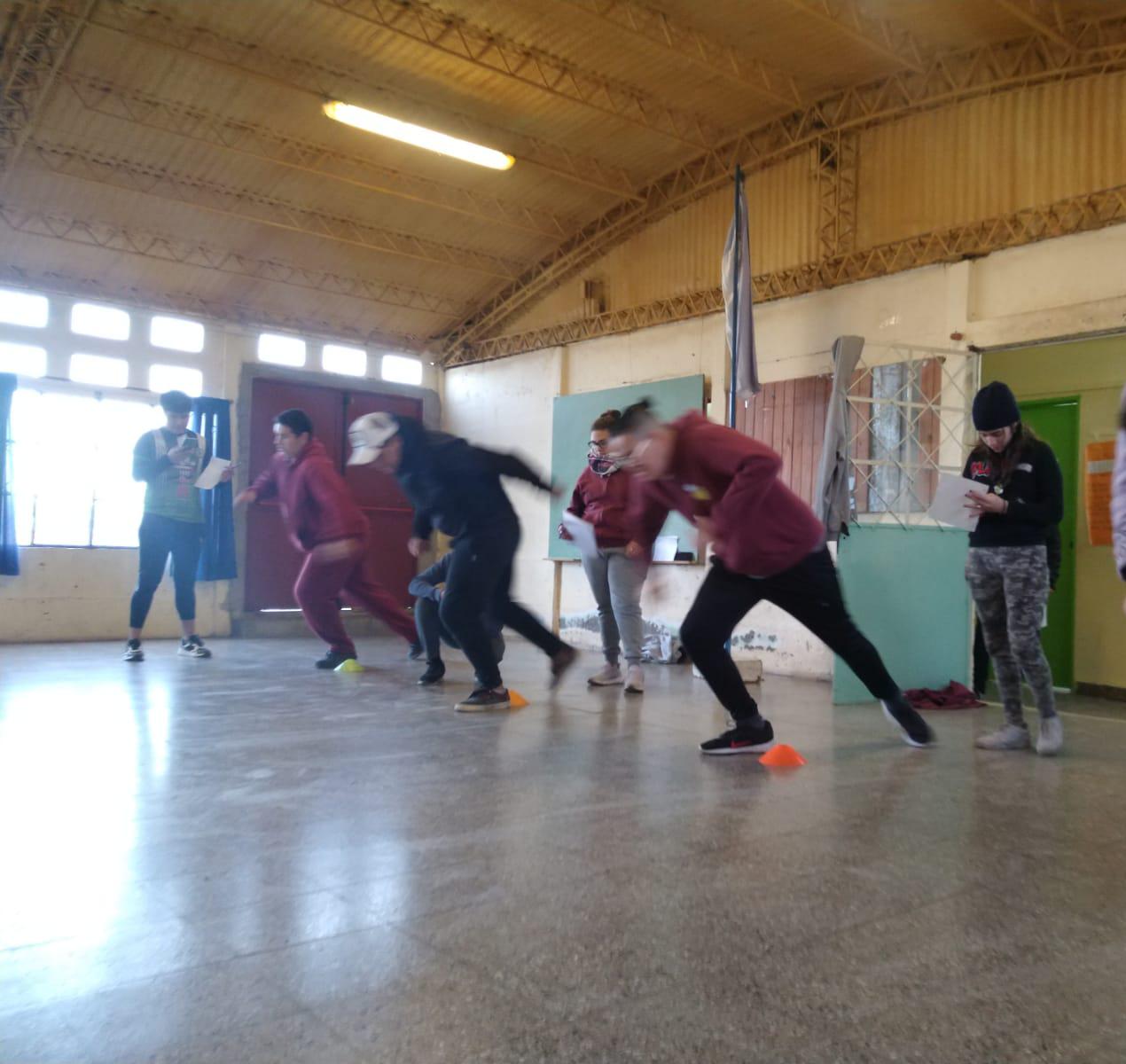 con la prfesora de fisica Silvia Bernardoni y la profe de educacion fisica Micaela Ortega se reúne en el patio de la institución. los alumnos hacen carreras y caminatas se miden distancias colocando conos y se mide el tiempo que tarda cada alumno por pasar por cada cono hacían caminatas, trotes y carreras. Se confecciona una tabla con los valores registrados de x(m) y t (s) ( x es la posición medida en metro y el tiempo medido en segundos). La curva obtenida en cada caso (trote, carrera ect). Permite describir de que tipo de movimiento se trata, mru (movimiento rectilinio uniforme) y mruv ( movimiento rectilinio uniformamente variado). Otra jornada se reliza tomando las medidas del lanzamiento de bala y descubrimiento este tipo de movimiento:tipo oblicuo.