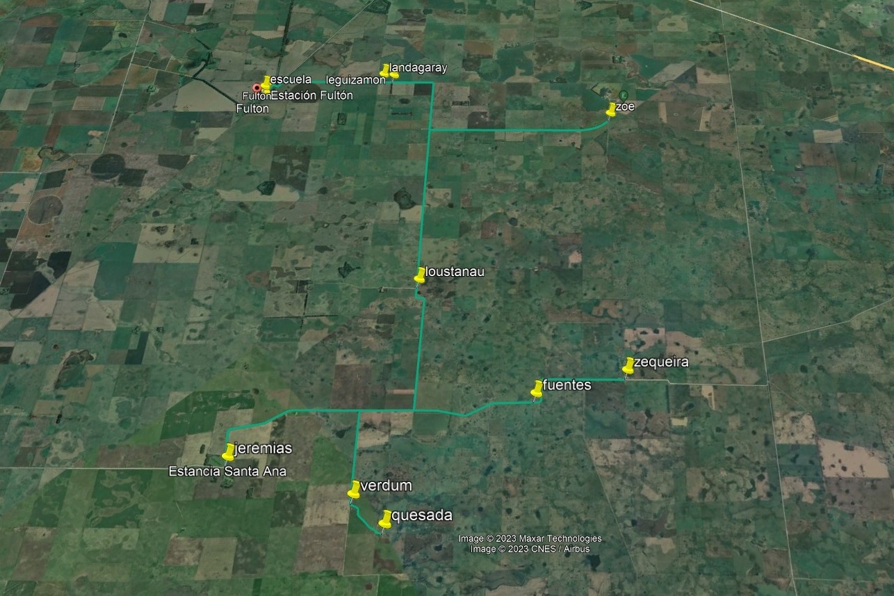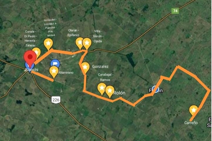 El recorrido comienza a las 6:50 cuando sube el primer alumno y arriba a la escuela alrededor de las 8:10. A las 16:00 comienza el regreso y termina a las 17:10 cuando el último estudiante desciende. En este recorrido hay un total de 22 alumnos. Su trayecto es de 85km , pero debemos destacar que aparte de eso cuenta con viaje de regreso y de jardín al mediodía . Consta de un camino de tierra no se encuentra en buenas condiciones, debido a que el entoscado está deteriorado ya que es viejo. Igualmente durante el mismo recorrido no hay mucha señal.